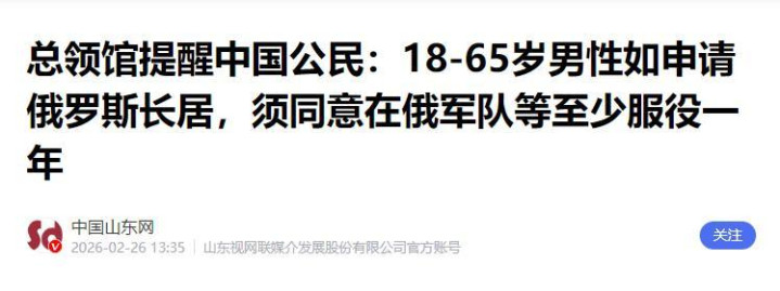而近期普京签署的一项兵役新规,更是直接戳破了俄罗斯的窘迫现状:只要是18到65岁的外籍男性,在俄罗斯长期居住,或者申请长期居留权,就必须签署至少一年的兵役合同,要么就提供免服兵役的证明。