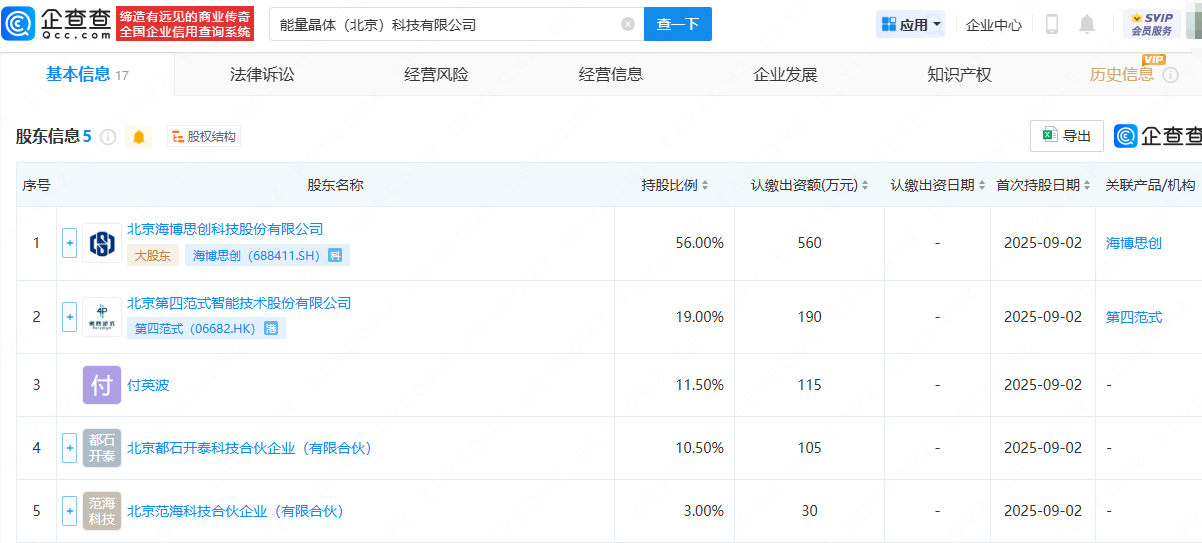 近日易多投资,能量晶体(北京)科技有限公司成立,法定代表人为杨洸,注册资本为1000万元,经营范围包含:储能技术服务;人工智能应用软件开发;人工智能行业应用系统集成服务;人工智能通用应用系统等。企查查股权穿透显示,该公司由海博思创(688411)、第四范式(06682.HK)等共同持股。