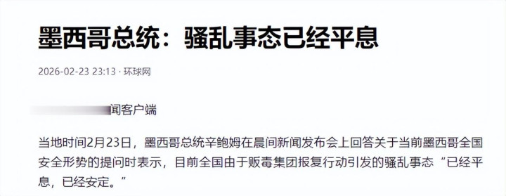 中东局势愈演愈烈,美国不仅集结了23年来最强大的空中军事力量,还把现役海军力量的约三分之一也部署在中东,以色列也做好了随时加入美军行动的准备。如此剑拔弩张的形势,不会有人认为,特朗普只是在虚张声势。然而,特朗普从来就不是一个“按套路出牌”的人,他随时可以开启混乱,但具体地点也由他随意选择。当地时间2月23日,还在庆祝世界杯倒计时的墨西哥,一夜之间就切换到了战时状态,因为美墨联手“斩首”毒枭内梅西奥·奥塞格拉·塞万提斯的行动,引发了墨西哥15个州的混乱。本就脆弱的平衡被打破,火焰、枪声充斥着墨西哥的城市。