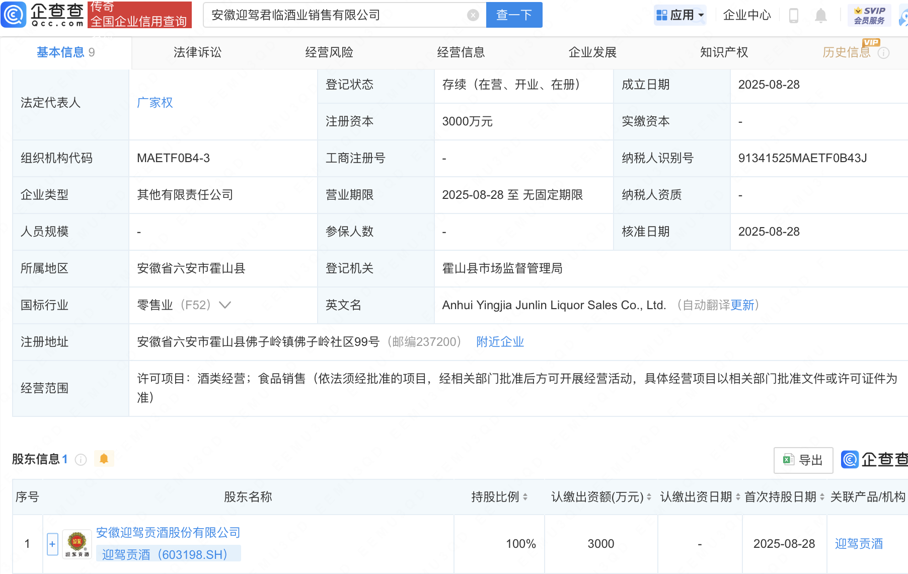 近日精选期货配资,安徽迎驾君临酒业销售有限公司成立,注册资本3000万元,经营范围包含:酒类经营;食品销售。企查查股权穿透显示,该公司由迎驾贡酒(603198)全资持股。
